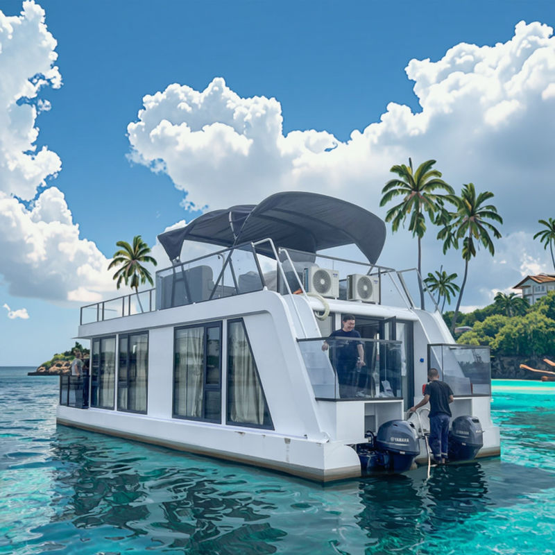 Experience the beauty of waterfront living with the House Boat, an aluminium houseboat that combines style, comfort, and performance in one impressive package. Whether you're looking to unwind in style or entertain guests in a stunning setting, this water house boat has everything you need to make your time on the water truly unforgettable.