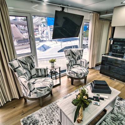 The house boat is constructed from high-quality aluminum, ensuring durability and longevity even in marine environments. The sturdy material not only adds to the structural integrity of the house boat but also gives it a sleek and modern look.